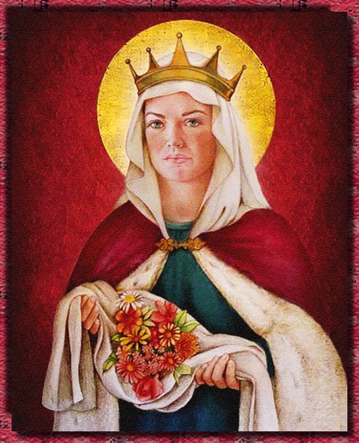 Conta-se que, certa vez, quando levava algumas provisões para os pobres nas dobras de seu manto, encontrou-se com seu marido, que voltava da caça. Espantado por vê-la curvada ao peso de sua carga, ele abriu o manto que ela apertava contra o corpo e nada mais achou do que belas rosas vermelhas e brancas, embora não fosse época de flores. Dizendo-lhe que prosseguisse seu caminho, apanhou uma das rosas, que guardou pelo resto de sua vida.